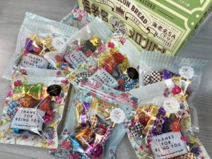 ※海老名PAの有名なメロンパンの箱に入れて配りました